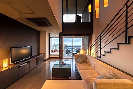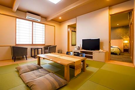 The spacious family room offers air conditioning, tatami, as well as a shared bathroom boasting a bidet and a hairdryer. The unit has 2 beds and 3 futons.