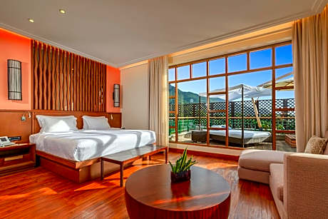 This spacious suite is equipped with a living room with a cozy sofa is complemented with a dining area, a 22 square yard balcony with ocean views and a kitchenette that makes you feel at home.
