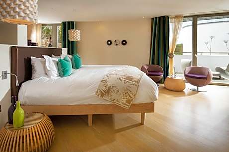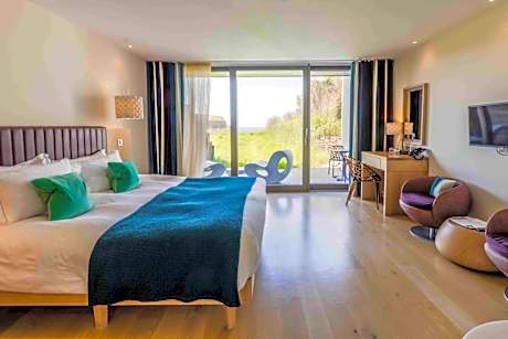 Settled within the rugged Cornish clifftops is Scarlet Hotel - Adults Only; an eco-sanctuary with far-reaching views of the crashing waves and sandy coastline that blend into the Atlantic. This adult only property exudes natural calm seamlessly bringing the outside in with simple design esthetic and tall glass walls showcasing the wild natural surrounds. Each of the airy rooms has an outdoor space and sliding doors so guests can be soothed by the sound of the sea and wind. The Scarlet’s restaurant offers captivating views of the coastline and serves up seasonal, responsibly sourced food alongside sustainable, slow-aged wine. The restaurant is open for breakfast, lunch, afternoon tea and dinner daily. The menu showcases natural and flavorful food. Tasting menus are available for a journey through the careful concoction of different tastes, textures and techniques at the Scarlet restaurant. Scarlet Spa’s an eco spa featuring a indoor pool, outdoor natural reed pool, clifftop cedar wood sauna, restorative steam room and wide views of the blue Atlantic. Treatments take place in tented, lantern-lit rooms and include stillness afterwards in the deep relaxation room’s suspended cocoon pods. Merlin Golf Club and Driving Range is a 5-minute drive away, and Newquay can be reached in 15 minutes by car. Padstow is within a 20-minute drive and Newquay Cornwall Airport is a 7-minute drive from the building.