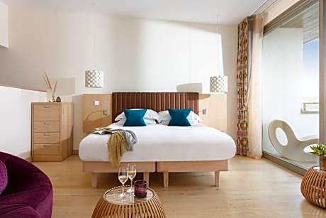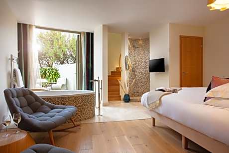 This room has a bath tub and shower, as well as a balcony and sea view. The sitting area also features a sofa.