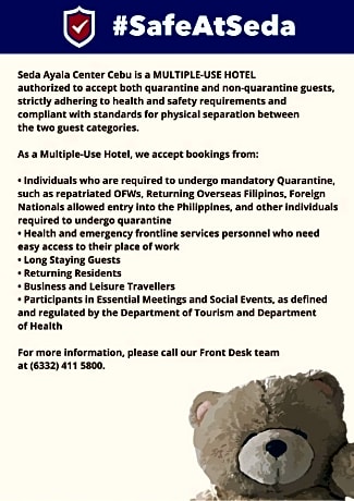 Seda Ayala Center Cebu provides flawless service and all the necessary facilities for visitors.Stay connected with your associates, as complimentary Wi-Fi is available during your entire visit. To facilitate your arrival and departure, you can pre-book airport transfer services prior to checking in.The hotel offers taxi and car hire amenities for your ease in navigating around Cebu. When arriving by car, you'll be grateful for the on-site complimentary parking at hotel.The hotel offers reception amenities including concierge service, express check-in or check-out, luggage storage and safety deposit boxes to ensure a comfortable stay for guests. Should you require it, the tours can even assist you in booking tickets and securing reservations for the finest shows and events in the vicinity. Whether it's an extended stay or simply needing fresh attire, dry cleaning service and laundry service provided by hotel ensures your cherished travel garments stay spotless and accessible. Your stay will be comfortable with the presence of room service and daily housekeeping as an in-room amenity for your relaxation and enjoyment.To ensure the well-being and convenience of all visitors, smoking is strictly prohibited throughout the entire hotel. Smoking is permitted solely in the specified smoking zones allocated by hotel. In order to ensure the utmost level of relaxation, the guestrooms feature an inviting design and are equipped with all basic necessities, creating a delightful stay experience.To ensure a pleasant stay, a selection of rooms at hotel come furnished with linen service, blackout curtains and air conditioning, all designed with your ease in mind. In select rooms, visitors can enjoy a touch of amusement with the availability of television and cable TV for their entertainment needs. Within specific rooms, bottled water, instant coffee and instant tea is conveniently available for your use.Understanding the significance of bathroom facilities in enhancing visitor contentment, hotel offers a hair dryer, toiletries and bathrobes within a few chosen chambers. To experience refined leisure, do not miss the opportunity to drop by the executive lounge. Start your day stress-free at Seda Ayala Center Cebu as breakfast is made available for you on the premises.How about kicking off each day of your getaway with a delicious cup of coffee? At the hotel, relish in the invigorating taste of a freshly brewed, excellent coffee. Various excellent meal offerings at hotel ensure that enticing and easily accessible options are constantly available. Upon your arrival, don't miss experiencing bar for enjoyable in-house evening entertainment.Throughout the day, engage in the entertaining activities available at Seda Ayala Center Cebu. Guests who enjoy maintaining their fitness regimen while on holiday can visit the fitness center provided by hotel.