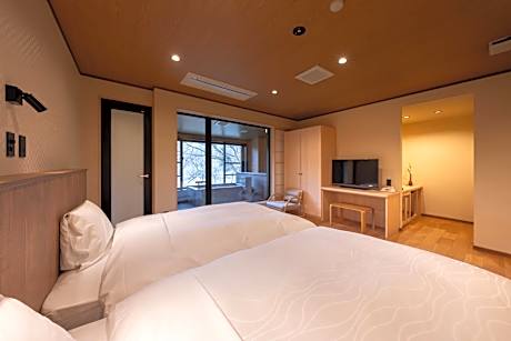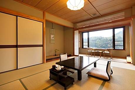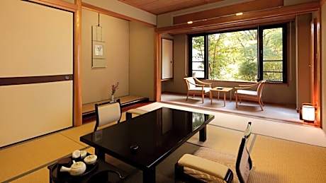 Features tatami (woven-straw) flooring and Japanese futon bedding. This room includes a TV and private toilet. Bathroom is shared.