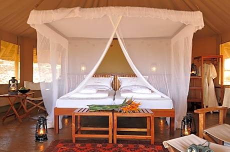 At Severin Safari Camp, nature comes first. Set within the Kitani Wildlife Circuit of Tsavo West National Park, the camp is unfenced, allowing wildlife to roam freely around the waterholes right in front of your accommodations. Guests enjoy an infinity pool, spa, gym, and free high-speed WiFi. All in harmony with the wilderness. Luxury Tents, Junior Suites, and Suites each feature a private bathroom and bidet, with direct views of one of several waterholes. The Kitani self-catering cottages, located about 0.6 mi away from the main camp and only accessible by car, offer complete privacy in the open Savannah, without included meals. From guided bush walks to night drives and sundowners, unforgettable safari experiences await. Mzima Springs (9.3 mi) and Poacher’s Lookout Hill (7.5 mi) are just a short drive away. Mtito Andei Railway Station is 28 mi from the camp. Please note: park fees, drinks, and activities are not included in the room rate.