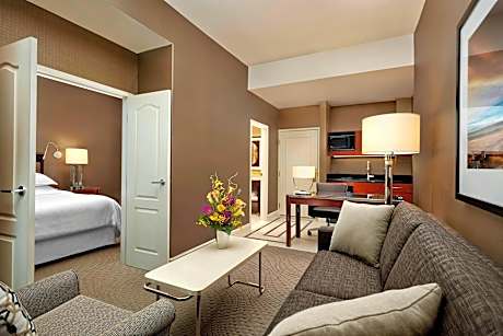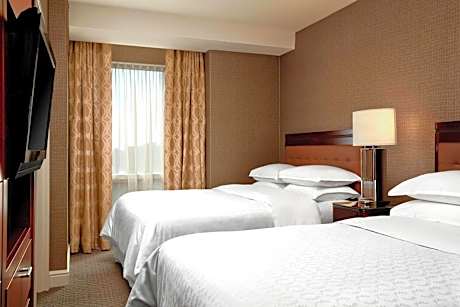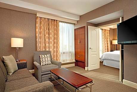 Featuring a restaurant and pub, this Calgary hotel includes a pool with waterslide and a hot tub. An on-site fitness center is open to all guests. HDTV is provided in each guest room. A seating area is offered in air-conditioned suites at Sheraton Suites Calgary Eau Claire. A microwave and a work desk are also included. Free toiletries are provided for added convenience. A hair salon and a business center are on site. Ski storage is available. CORE Shopping Center is 1.2 mi from Sheraton Suites Calgary Eau Claire. Calgary International Airport is 11 mi away.