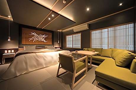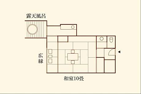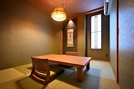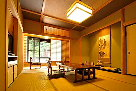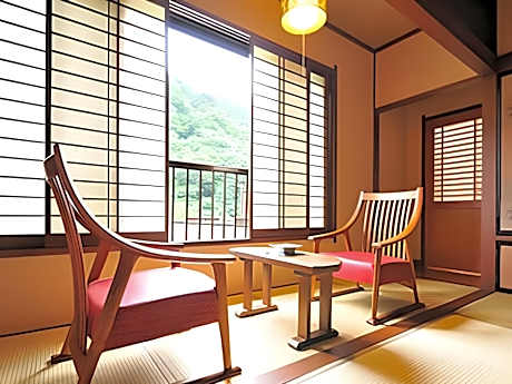 Room with a tatami (woven-straw) floor, on which guests sleep in traditional futon bedding. It’s fitted with an LCD TV, a fridge and yukata robes. The room has an attached toilet, while bathing facilities are shared. Room is a simple 10-mat (tatami) Japanese style. The windows allow seasonal breezes to blow through, and the view of the Fusenkyou Gorge with the Shima River flowing below is spectacular.