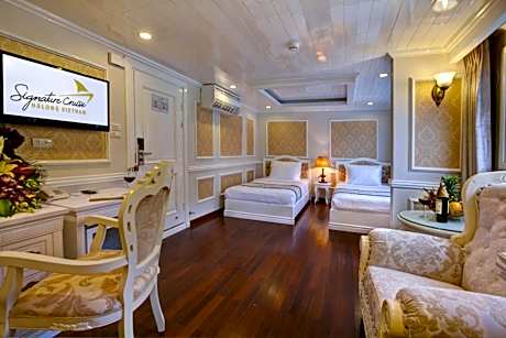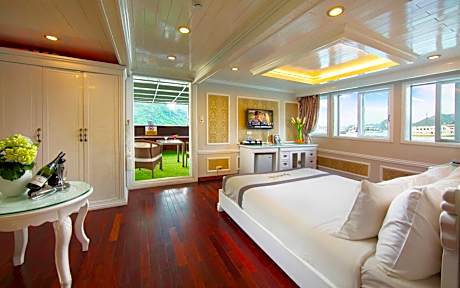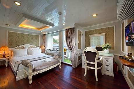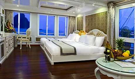Housed in a traditional wooden boat, Signature Halong Cruise offers luxurious suites with stunning views of Ha Long Bay, a UNESCO World Heritage Site and Bai Tu Long Bay. It has a rooftop sun terrace and provides free Tai Chi lesson on board. Featuring French-inspired décor, air-conditioned suites come with parquet flooring, a wardrobe, seating area and a flat-screen TV with cable channels. A safe and mini-bar are also included. The private bathroom is equipped with a bathtub, hairdryer, slippers and free toiletries. Signature Halong Cruise operates a 24-hour front desk that can assist guests with luggage storage. During the journey along Ha Long Bay, guests can enjoy various activities such as fishing, snorkeling and kayaking at a surcharge. Massage treatments can also be arranged on request. The on-board restaurant serves a delectable spread of Vietnamese and Western cuisine from 07:00 to 21:00. A variety of drinks and light snacks are offered at the bar. Meals can also be enjoyed in the comfort of guests’ rooms. Signature Halong Cruise takes about 4 hours to reach Cat Ba Island. Cat Bi International Airport is 50 mi away, while Noi Bai International Airport is approximately 106 mi away.
