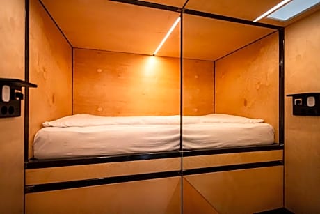 Single bed in a 5-bed dormitory. Each dormitory room has a sleeping area, a kitchen and a bathroom.
