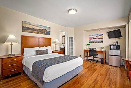Along with cable TV and free Wi-Fi, this room also includes a refrigerator and a private bathroom.
