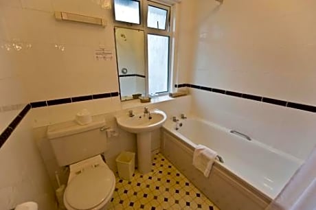 This room has an private bathroom with walk in shower. Beds feature white duvets.