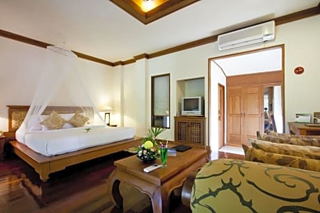 Fitted with wooden flooring, this spacious villa features a private patio and a dressing area.