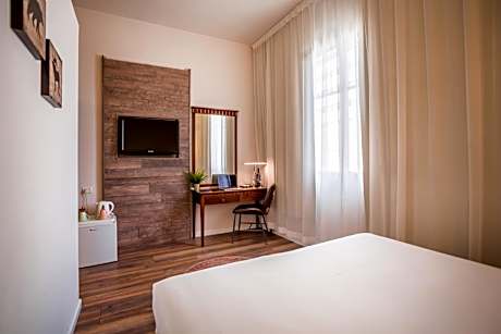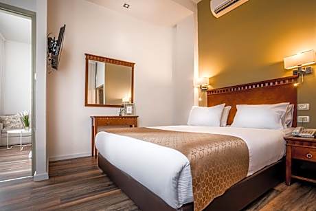 Room with attached bathroom with parquet floors. Offers free Wi-Fi, air conditioning, and a flat-screen TV with cable channels.