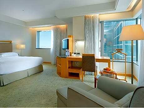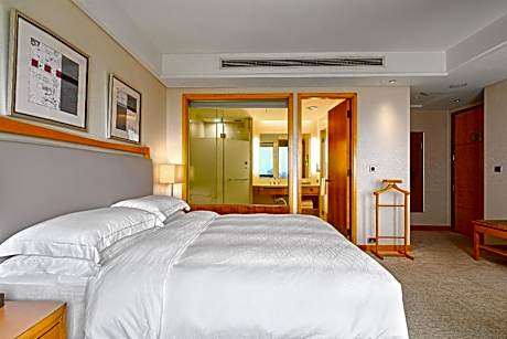 These two adjacent rooms each include a king bed, shared foyer, smart TV with casting, drip coffee, snacks, a work desk, and central air. Marble bathrooms feature separate wet/dry areas.