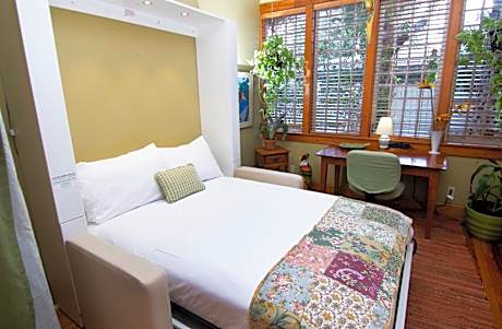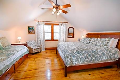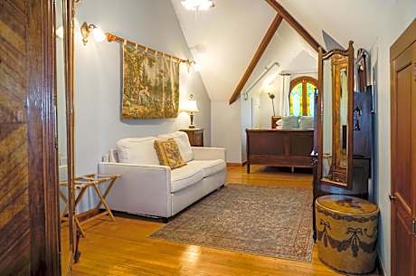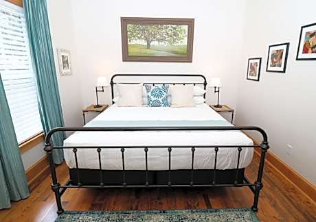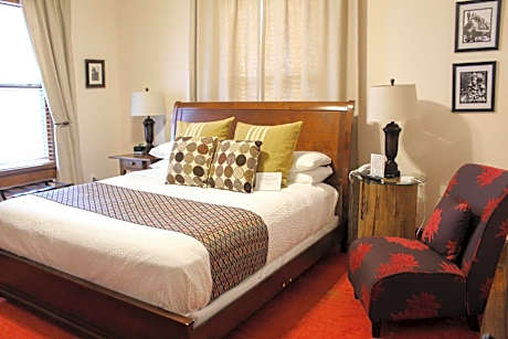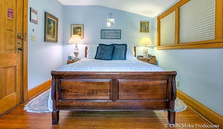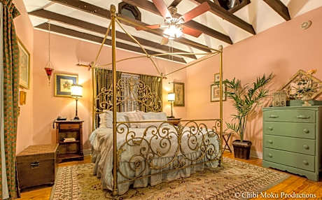 Featuring a mural of a wisteria tree, this queen room is located on level 2 and includes a fireplace and private bathroom with walk-in shower.