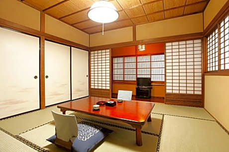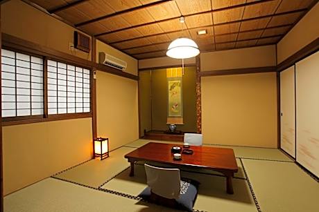 Air-conditioned room with a tatami (woven-straw) floor and traditional futon bedding. It’s fitted with a low table with seating cushions, an LCD TV and a fridge. Toilets and bathrooms are shared.
