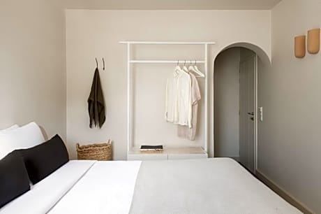 A cozy 10-12m², ground-floor hideout ideal for shorter stays. It features a comfortable double bed, elegant wooden flooring, and marble details (likely in the bathroom or on surfaces). The room includes a private patio and provides a sense of intimate refuge with its inner-alley or courtyard orientation (no view).