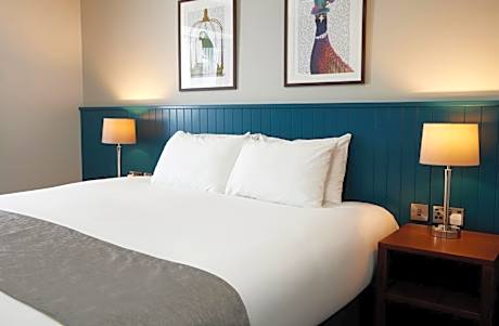 This neutrally decorated bedroom features tea/coffee making facilities and a TV with a selection of Sky channels.