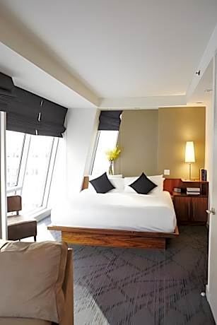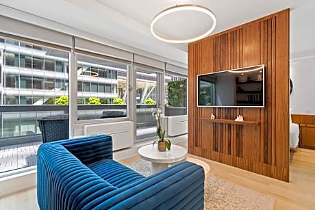 Each room at The Gotham boasts loft-like ceilings and expansive windows, creating a bright and airy atmosphere. The sophisticated bathrooms are adorned with Italian glass mosaic tiles and come equipped with premium Whish apothecaries and Dean & Deluca amenities. Select rooms feature private balconies, offering a personal retreat with stunning city views. Evening turn-down service adds an extra touch of comfort to the stay.
