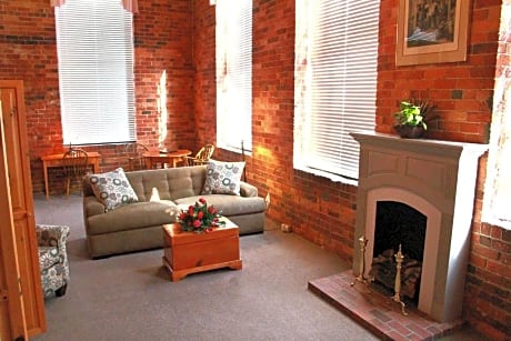 Each room at The Historic Brookstown Inn features warm colors and period wood furnishings, providing a cozy and comfortable stay. Amenities include a cable TV, small refrigerator, microwave, and select rooms boast hardwood floors and exposed brick walls, adding to the historic charm.