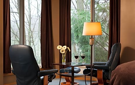 This spacious room features a flat-screen cable TV, plush bathrobe and slippers, and an private bathroom.