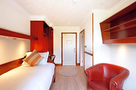 Modern and compact room with one single bed and private shower and toilet.