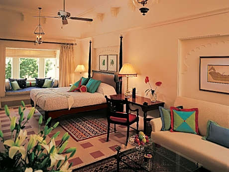 Spread over 50 acres, pavilions and domes feature at The Oberoi Udaivilas, which features grand architecture inspired by the palaces of Rajasthan. The property is built on 200-year old hunting grounds of the Maharana of Mewar. Located on the banks of Udaipur’s Lake Pichola, it has 3 restaurants, 2 heated outdoor pools and a luxurious spa. Free WiFi is available in the rooms of the property. Courtyards, fountains and gardens occupy the Oberoi Udaivilas Udaipur. Approximately 5 mi from Udaipur Railway Station, the 5-star property is a 45-minute drive to Udaipur’s Maharana Pratap Airport. Spacious and modern, each room has a seating area by the window. Artworks and rugs decorate the rooms, which are equipped with a flat-screen satellite TV, DVD player and electronic safe. They also include a mini-bar and marble bathroom with views. A variety of movies and audio CDs are available for guest to borrow. Practice yoga, learn a Rajasthani folk dance or attend a cooking lesson with the in house chef. A more relaxing option is a skikara (wooden boat) ride with wine and canapé. Udaimahal Restaurant specializes in traditional Indian food including Rajasthani and North Indian dishes. Order Western, Mediterranean and Thai food at Suryamahal or enjoy open-air dining with traditional music and dance evening performances at Chandni. 24-hour in-room dinning is also available.
