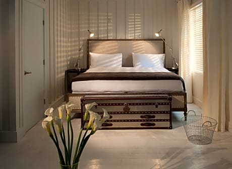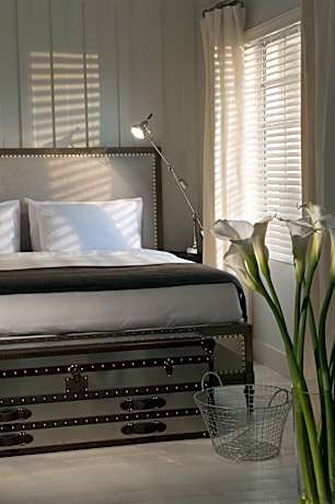 Featuring decorative steamer trunks and bead-board details, this full rooms offers a small refrigerator and a safety deposit box.