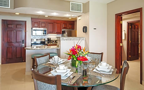 The Junior Suite features a small kitchenette equipped with microwave, coffee machine, and a small fridge. The private bathroom has both a tub and a rainfall shower. The suite is air conditioned, has a flat-screen cable TV, safe deposit box and a small balcony overlooking the Caribbean Sea.