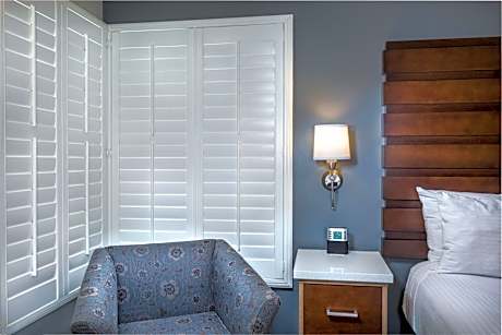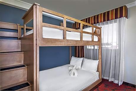 This suite offers 1 bedroom with 1 king bed and a separate kids room with a double bunk bed that sleeps 4. There is also a separate seating area.