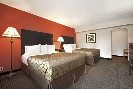 This family room has a microwave, air conditioning and cable TV. This two bedroom suite features a kitchenette, living room and three queen beds.