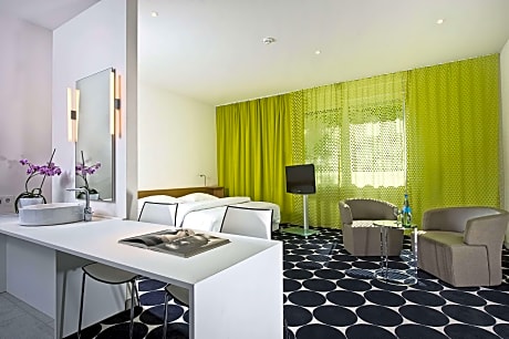 Stylish room with bright décor offers a flat-screen TV and a mini-bar.