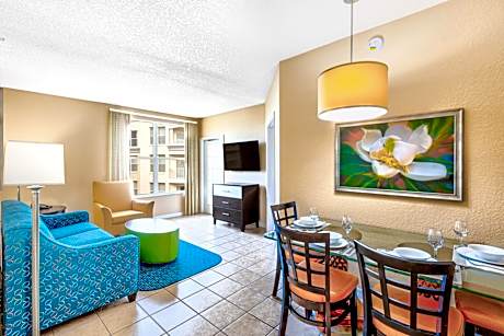 Located within 4 mi of the Walt Disney World Resort, this Orlando resort features 7 heated outdoor pools and 7 hot tubs. Suites have a fully equipped kitchen or kitchenette. Aquatica, SeaWorld’s water park, is 9.9 mi away. Suites include a balcony, full size refrigerator, and microwave. A cable TV is provided as well. All suites are also furnished with West Indies-inspired decor or more modern, relaxing decor. A fitness center, children's playground, and business center are on site. Guests can also enjoy access to 22 barbecue grills, poolside activities, and 2 nature walks throughout their stay. Every floor also has laundry facilities. Courtesy transfer service to the supermarket is available for guests. Guests will be 13 mi from Universal Studios and Islands of Adventure. Orlando International Airport is 21 mi away.