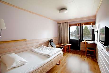This room has a single bed. The room also features wooden floors and a patio with views towards the River Västerdal.