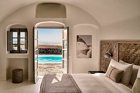 Built around a 400-year old winery, the 5-star Vedema Resort overlooks the rolling vineyards, the Aegean Sea, and the colorful sunsets. This superbly located resort offers true luxury in a beautiful, bright and minimalist design. Vedema Resort is located in the medieval village of Megalohori, 4.3 mi from Fira town. It has 74 fully furnished apartments and villas with private verandas, dining rooms and every modern comfort. All of them have beautiful romantic beds. Facilities at the resort include a swimming pool, big open-air hot tub, spa, fitness center, boutique, conference room, jewelry shop, minibus transfers and valet parking. Guests have access to a private beach 1.9 mi away with free towels, sun beds, umbrellas and bar service. American Buffet Breakfast or Greek breakfast is served daily in the dining area. Creative Mediterranean cuisine is served in the 3 on-site restaurants Pergola, Alati and Prive prepared by the hotel’s awarded Chef. Wine tasting can be arranged at the Wine Canava Cellar.