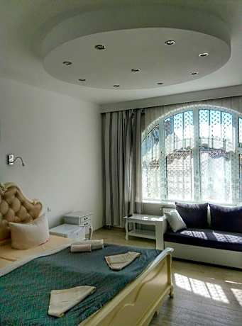 Spacious room in an old tenement house. Features high ceilings and a TV.