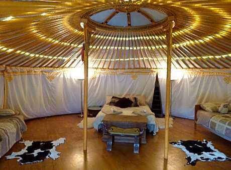 Imported from Mongolia, this 7-yard Yurt, farm-stay accommodations. It is set on a purpose-built, raised and insulated wooden floor. The walls and ceiling are completely insulated with thick camelhair, which means it is warm in winter and cool in the summer. An outdoor kitchen area, includes a pizza oven, gas barbecue, self-catering facilities and outdoor furniture. The yurt offers a separate private bathroom with a shower, toilet and sink.