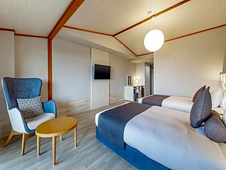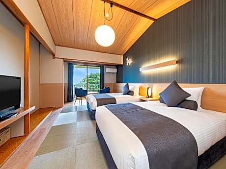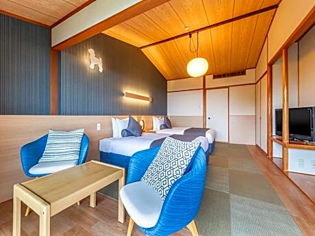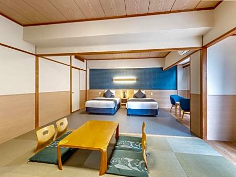 The spacious quadruple room features air conditioning, tatami, as well as a private bathroom boasting a bath and a shower. The quadruple room offers a tea and coffee maker, pajamas, heating, a flat-screen TV, as well as mountain views. The unit has 2 beds and 2 futons.
