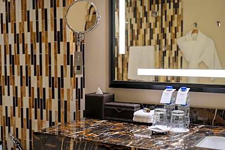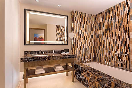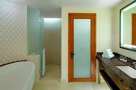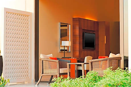 It also includes: • Internet access (Standard) • Separate walk-in shower and bathtub • Separate living space and work area • Media hub • Coffee machine • Private balcony