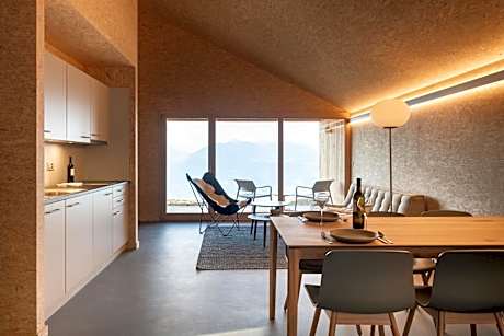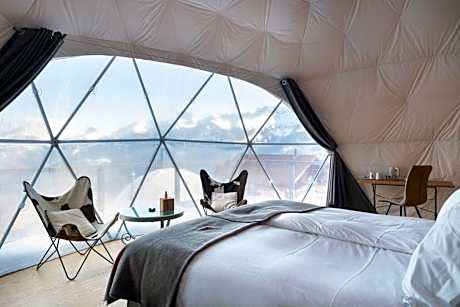 A spherical cottage perched on a wooden platform, the Pod is features large bay windows, a pellet stove and panoramic mountain views. The bathroom is en-suite and guests can relax on a furnished terrace. As extra beds are on a mezzanine, guests in extra beds would have to climb up a ladder to access their beds.